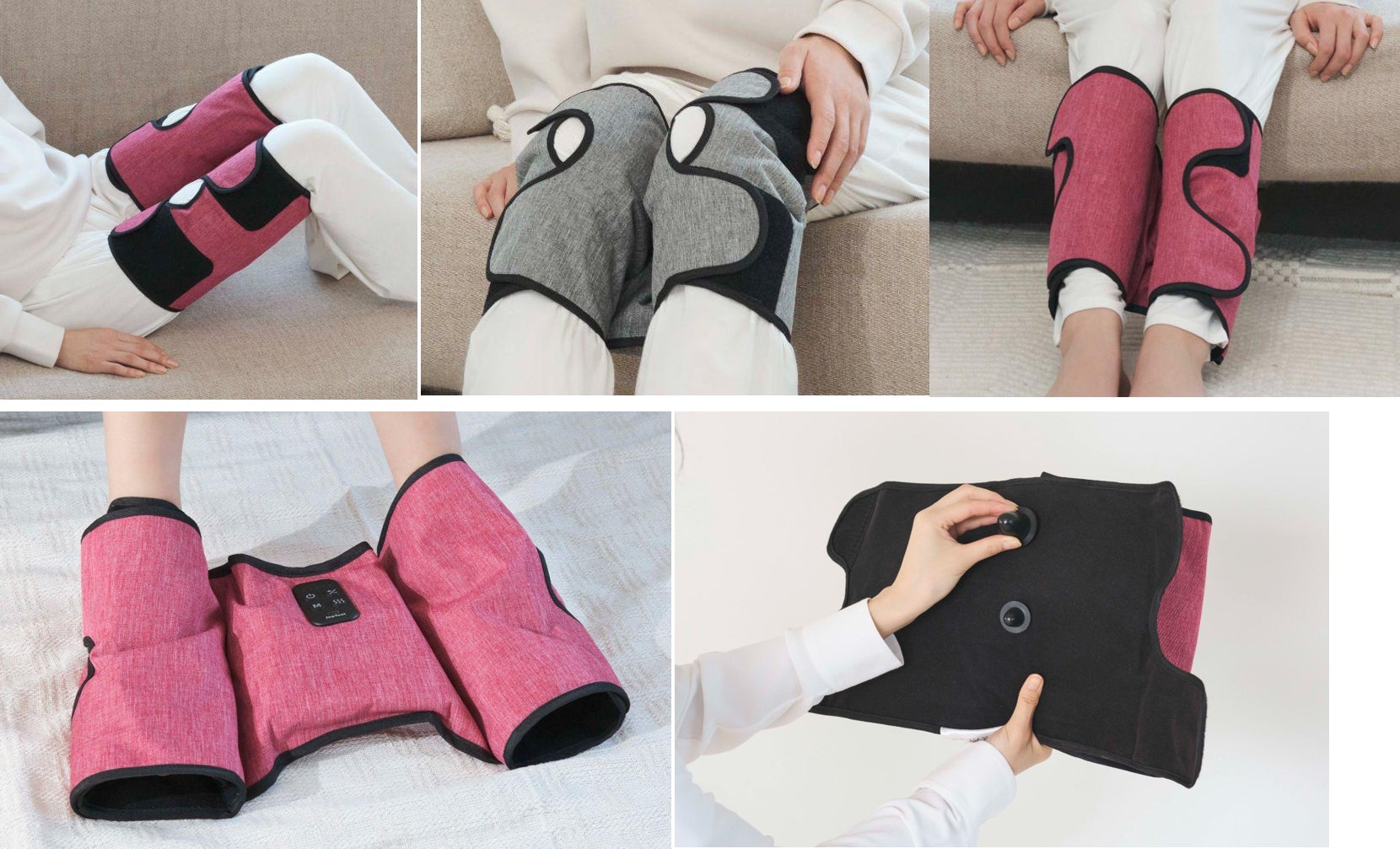 巻く位置を変えるだけで、太もも/膝まわり/ふくらはぎ/足裏を1台でケアできます。