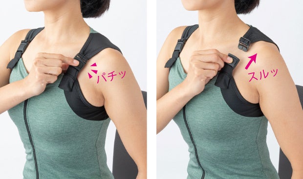 【着用方法】肩部のプラスチック製のバックルを軽く押すだけで肩ひもが簡単に外れます
