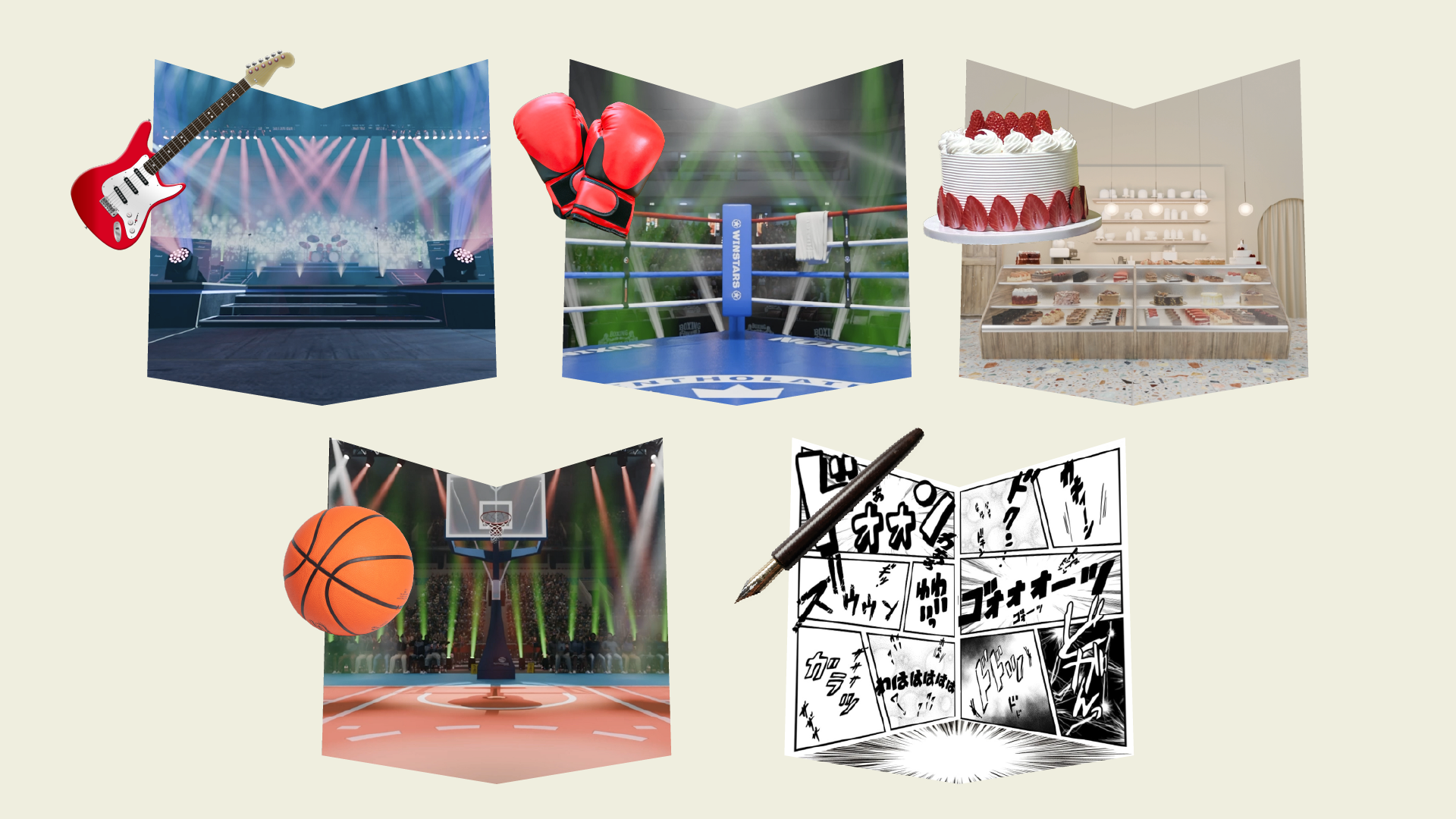 まず「バスケットボール(バスケ)」、「ボクシンググローブ(ボクシング)」、「ケーキ(おかしづくり)」、「ギター(演奏)」、「漫画用つけペン」の5つのアイテムからひとつ、自分の “やりたい!”をお選びいただきます。 そのアイテムを手に持ち、LEDスタジオに入ると、まるでアトラクションのようにそのアイテムの世界に入り込む体験ができます。最後には、その世界観でなりきり撮影を行います。