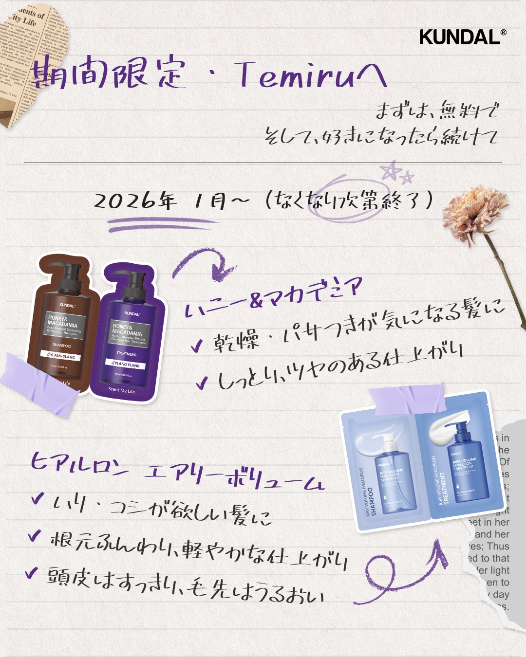 グローバルライフスタイルブランドKUNDAL(クンダル)は、2026年1月から日本の無料サンプリングお取り寄せサイト「Temiru(テミル)」にて、KUNDALの人気ヘアケア商品の無料サンプリングを開始いたします。