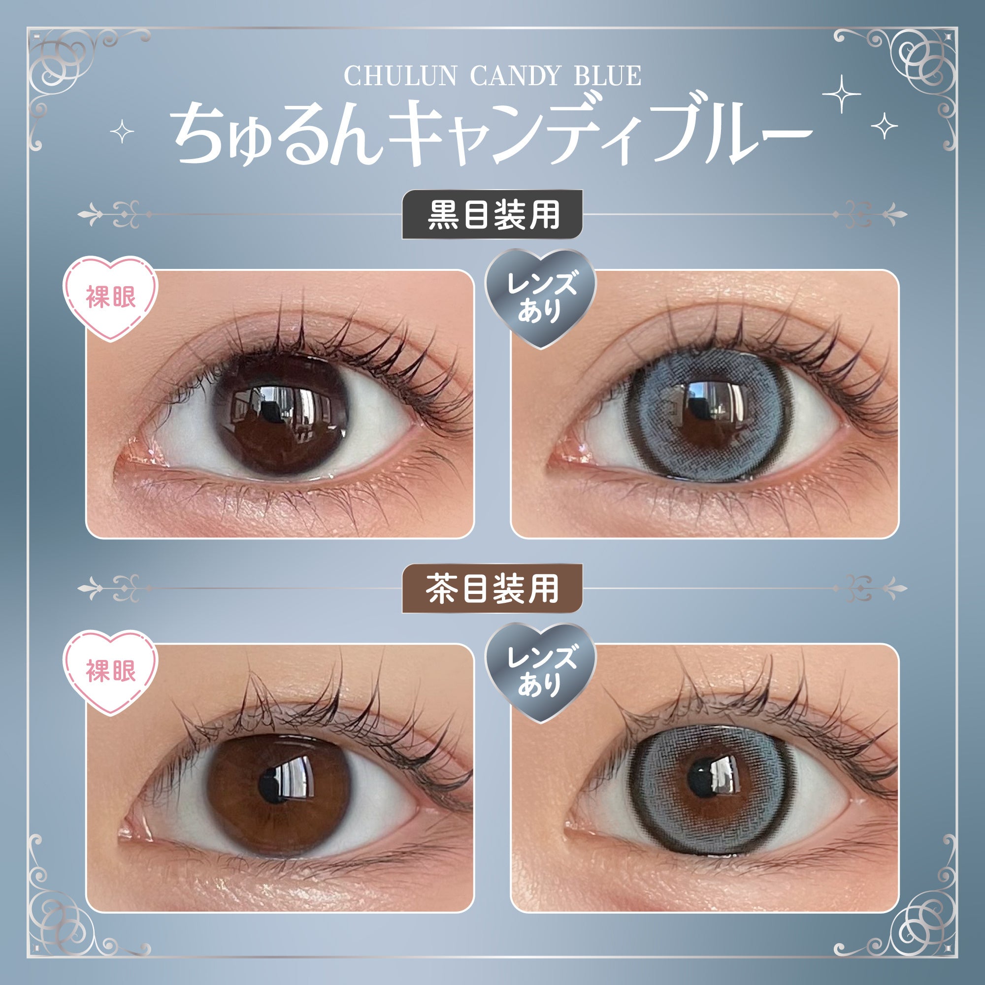 国内承認最大級サイズである直径15.0mmのキャンディシリーズから新色のグレーとブルーが登場。左右対称のダブル水光デザインがほんのり重なり、瞳にちゅるんとした潤い感を演出します。