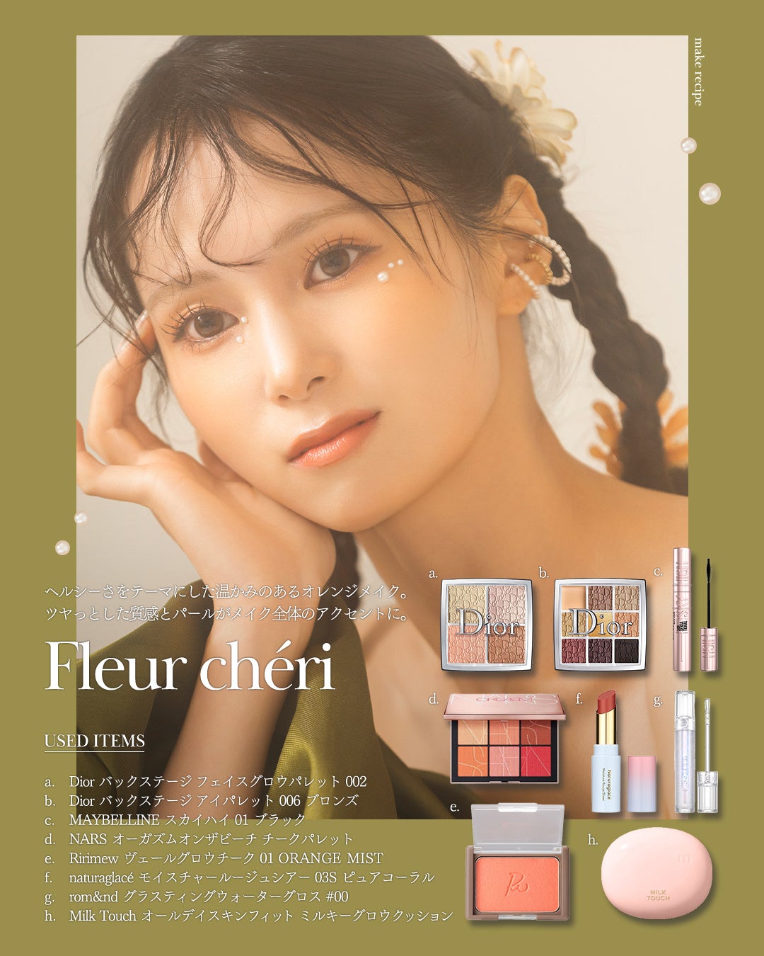 健康的でポジティブなオーラを放つオレンジメイク。ツヤっとした質感とパールをアクセントに効かせることで、カジュアルになりすぎず、特別な日の華やかさを演出します。笑顔が一番似合う、エネルギッシュで温かみのあるスタイルです。