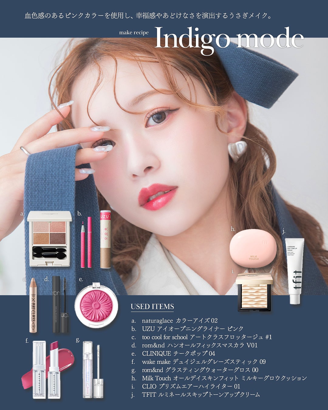 全体を柔らかなピンクカラーで統一し、頬の高い位置に入れたチークがじゅわっとした血色感をプラス。守ってあげたくなるような「あどけなさ」と、内側から溢れ出るような「幸福感」を表現します。可愛らしさの中にメリハリを持たせた、バランス感覚に優れた愛され顔へ。
