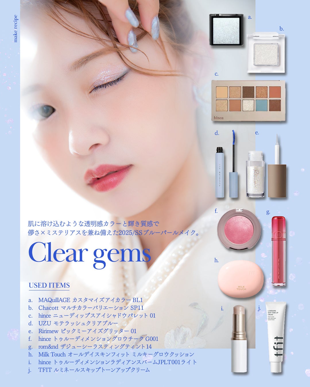 肌に溶け込むような透き通るカラーと、光を集めるパールの輝き。ブルーのラインとカラーマスカラをポイント使いすることで、決して奇抜にならず、洗練された統一感を生み出します。「儚さ」と「ミステリアス」が同居する、思わず触れたくなるような透明感を演出したい方に。