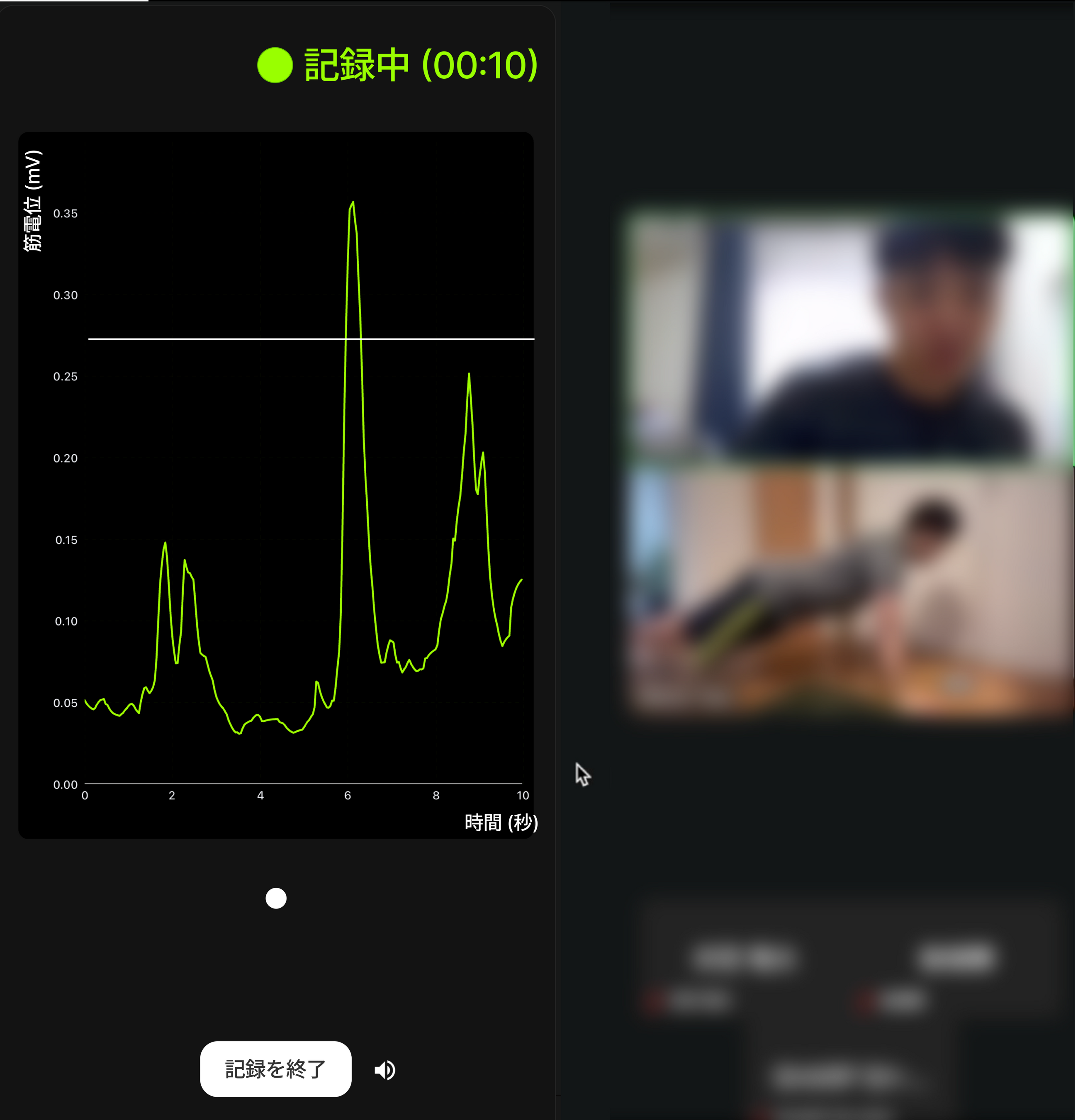 会員専用デバイス「筋肉Phone」を装着し、筋肉の電気信号(筋電)を計測しながらトレーニングを行います。 スマホアプリ上で、筋肉の収縮が「波形」と「音」としてリアルタイムにフィードバックされます。「効いたつもり」という主観的な誤差を排除し、プロのトレーナーでも肉眼では見抜けない、ミリ秒単位の微細な筋肉の反応を可視化します。