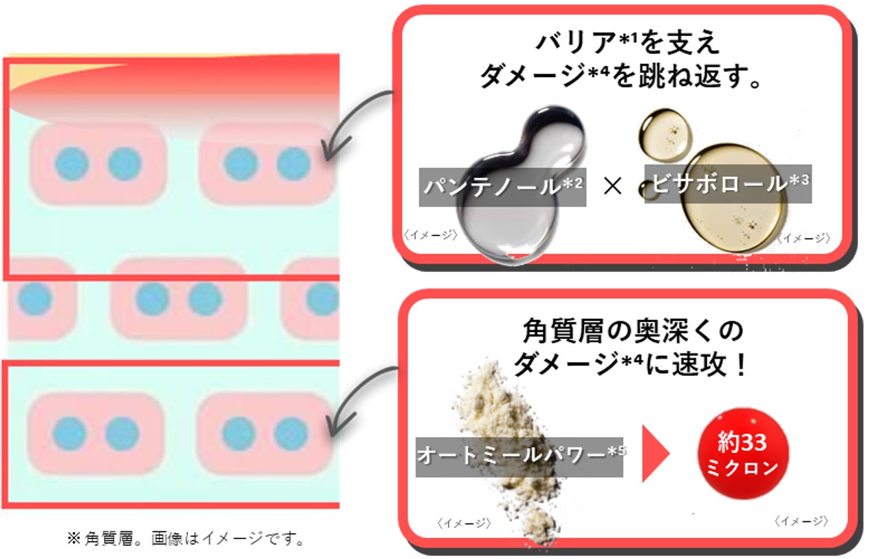 肌表面に最も近い角質層は、バリア機能*¹×保湿機能をもつ肌の最終防壁。サポートキー成分のパンテノール*²とビサボロール*³が肌表面のバリア機能*¹をサポートし、外的要因*⁴から肌を保護します。さらに、キー成分のオートミールパワー*⁵が角質層の奥深くのダメージ*⁴に速攻アプローチします。