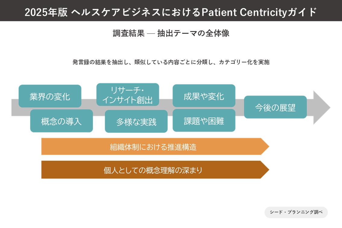 「業界の変化」と「概念の導入」、「リサーチ・インサイト創出」と「多様な実践」、「成果や変化」と「課題や困難」、「今後の展望」、「組織体制における推進構造」「個人としての概念理解の深まり」、これら9つのテーマを整理することで、実務者が語るペイシェント・セントリシティの全体像を立体的に把握することができました。