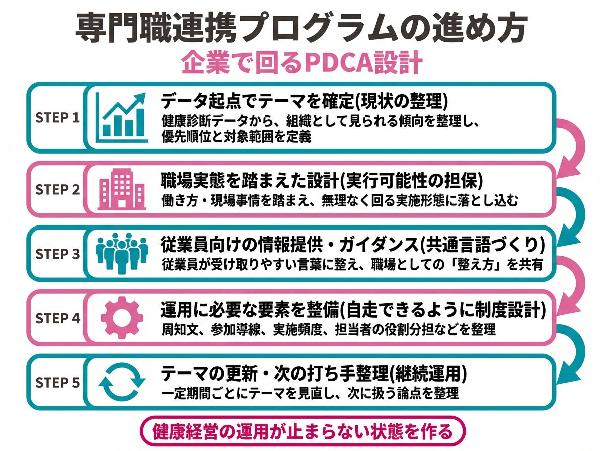 ・専門職連携プログラム:健康診断データを起点に、専門職が役割分担しながら、企業が実施しやすい施策設計と運用方法を整理する仕組みです。