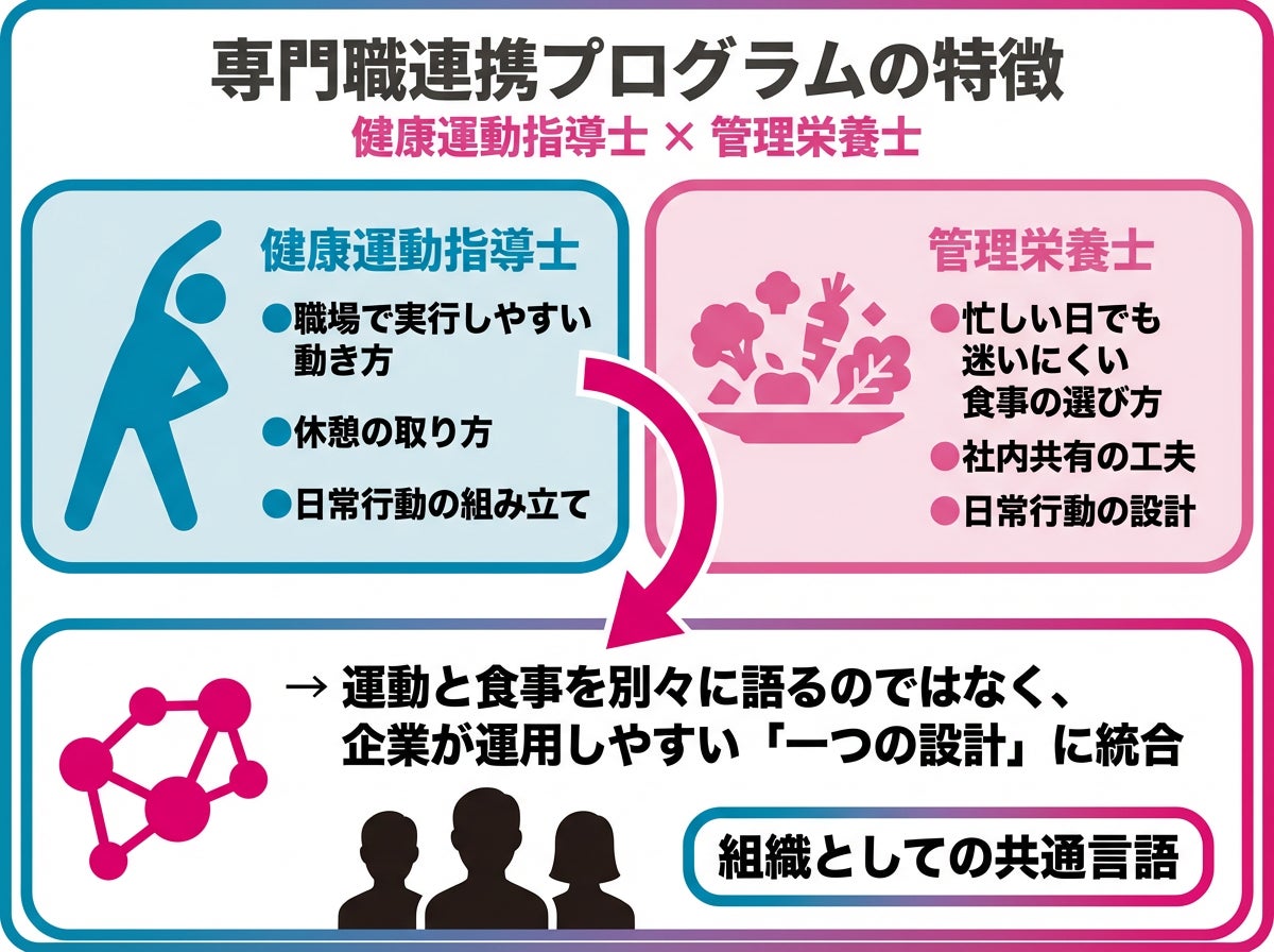 運動と食を別々に語るのではなく、企業が運用しやすい「一つの設計」として整える点が特徴です。