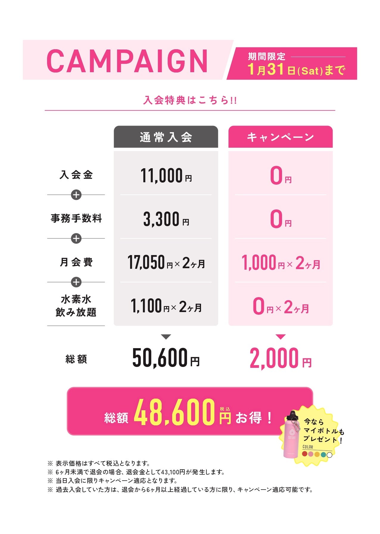 通常入会時に必要な費用が、キャンペーン期間中は以下の特別内容となります。