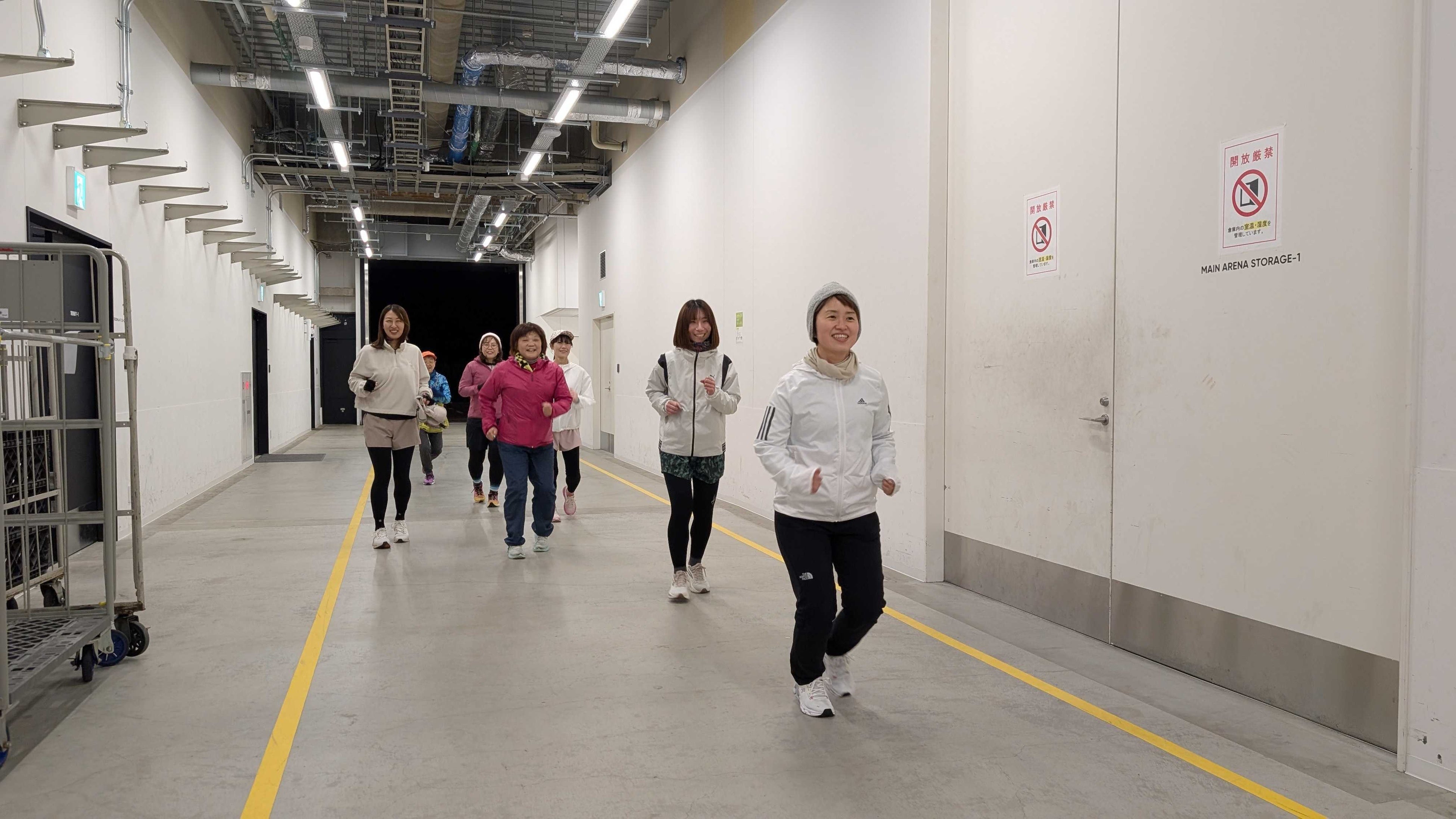 お一人での参加はもちろん、2人以上でチームを組んでの参加もOK。アリーナ内の客席を利用して、身体を冷やすことなく休憩することもできます。アリーナ自慢の大型壁面ビジョンでは、リアルタイムで表示される順位や周回数、ラン中の方の映像などをご覧いただけます。