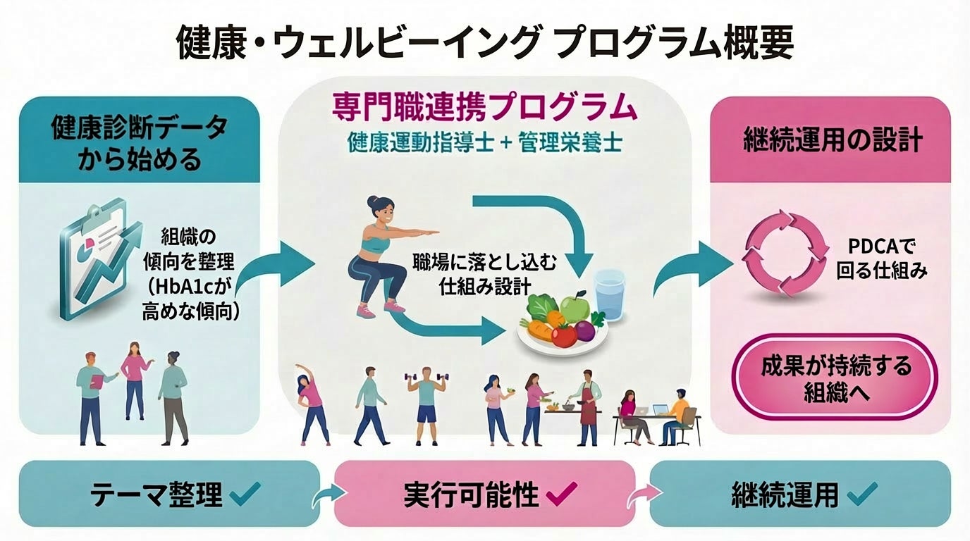 本テーマ(HbA1cが高めな傾向が見られる組織向け)では、健康診断データを起点に、次の2点を軸として取り組みを設計します。
