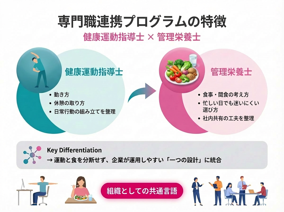 運動と食を分断せず、企業が運用しやすい「一つの設計」として整える点が特徴です。