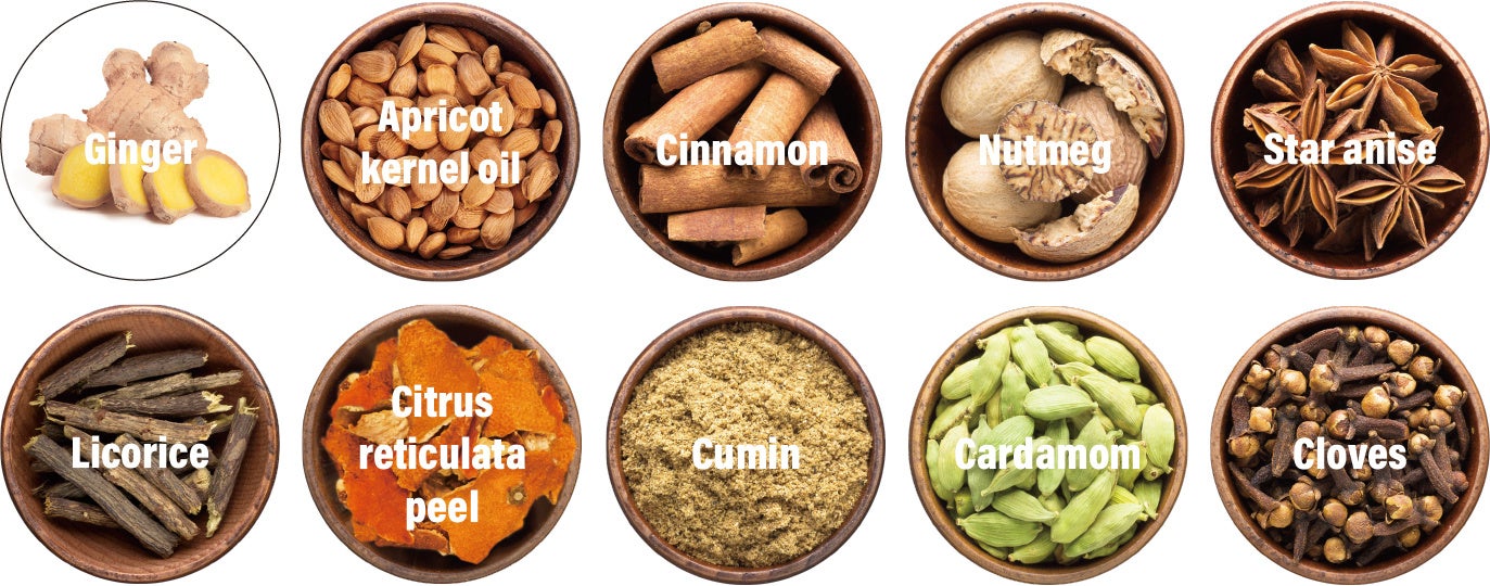 グラニュー糖(国内製造)、全粉乳、デキストリン、抹茶、黒糖、しょうが粉末、杏仁霜(ぶどう糖、でん粉、杏仁粉)、シナモン末、乳酸菌発酵粉末、クローブ末、ジンジャーエキスパウダー、食塩、ナツメグ末、カルダモン末、クミン末、スターアニス末、陳皮末/甘味料(カンゾウ)、(一部に乳成分を含む)