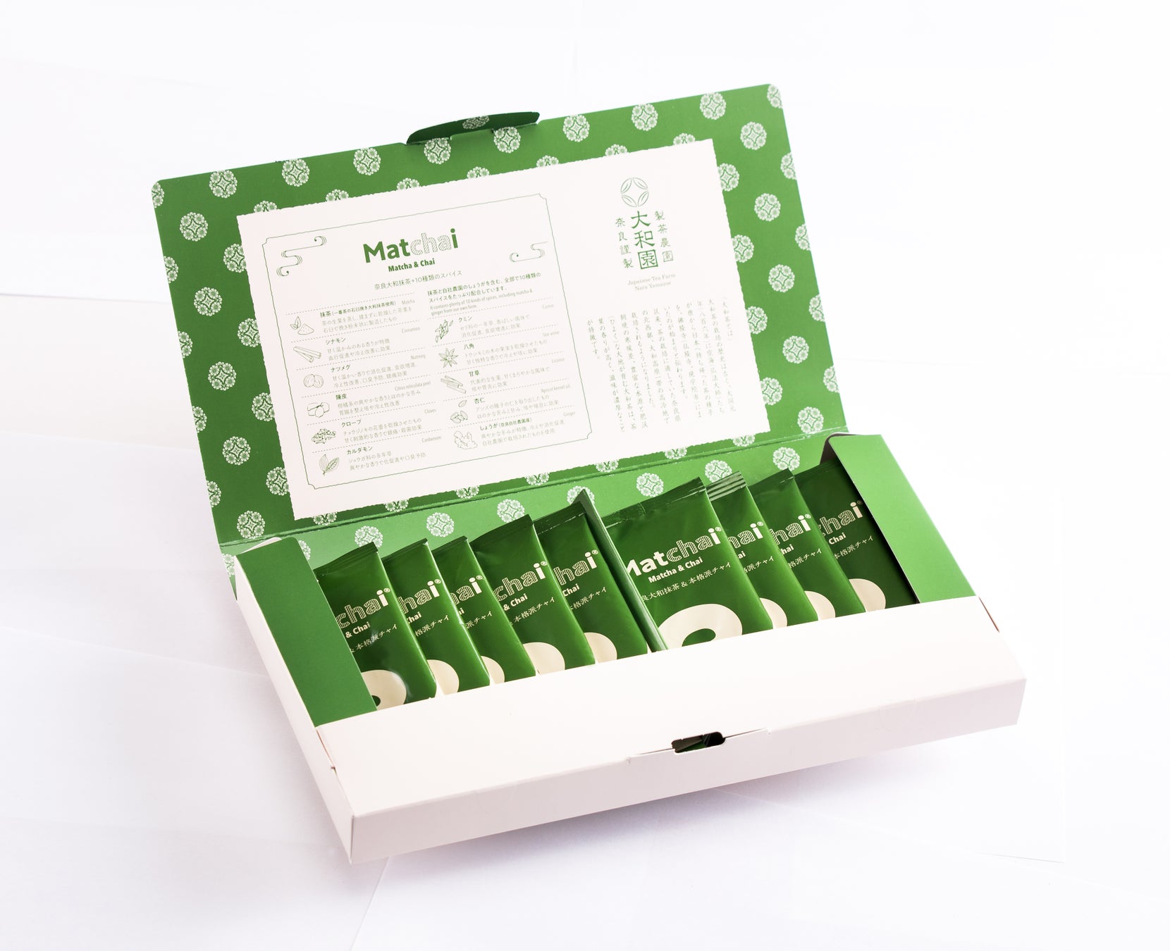 「Matchai(まっちゃい)」は体に良いとされる10種類のスパイスを贅沢に使用した本格派チャイに、奈良県「大和園」の一番茶を石臼で挽いた大和抹茶を贅沢に使用しています。