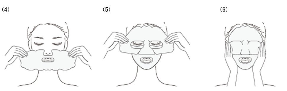 ● 次に、上用のマスクを袋から取り出し、そっと広げ、目もとの部分を外側にたおしてから両端を持ちます。目の位置に合わせ、額、目の下と軽く押さえ、鼻の部分にすきまができないようにフィットさせます。最後にまぶたの部分のシートをフィットさせます。(イラスト(5))