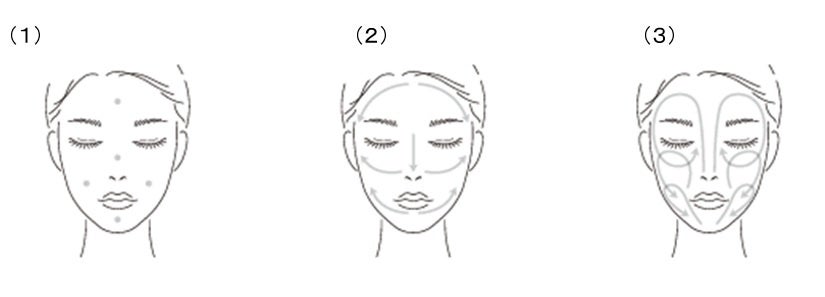 ● 手のひらに全量をとり、顔の5か所に置き、指全体を使って顔全体に広げます。(イラスト(1)(2))