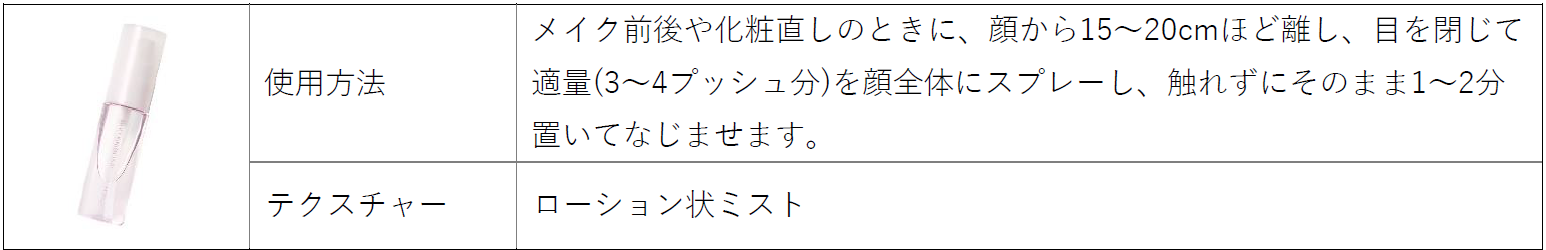 メイクの仕上げに吹きかけるだけで、メイクの持ちを良くし、にじむようなツヤを叶えるハンディサイズのミスト。こだわりのうるおい成分を配合し、花粉などの外的刺激から肌をガード。季節の変わり目の肌をやさしく包み込みます。