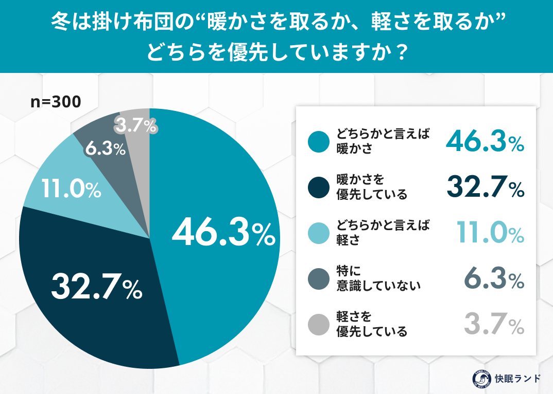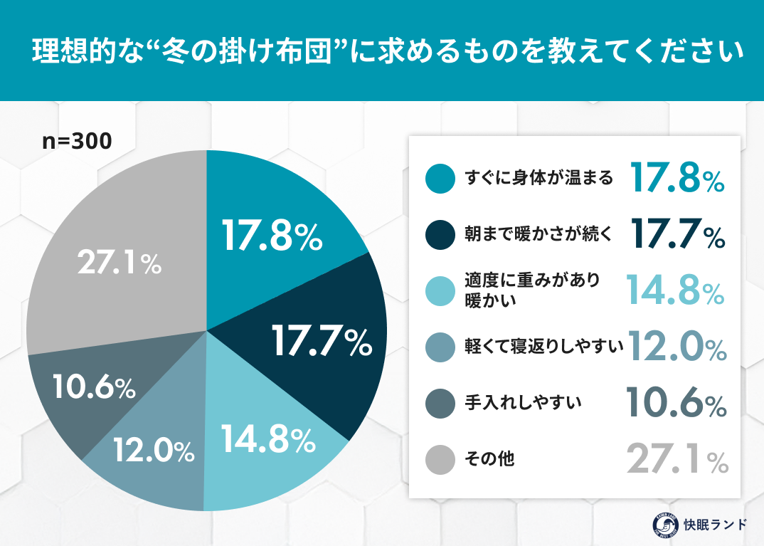 理想の掛け布団像は「暖かさ」に加え、「軽さ」「動かしやすさ」も重視されている