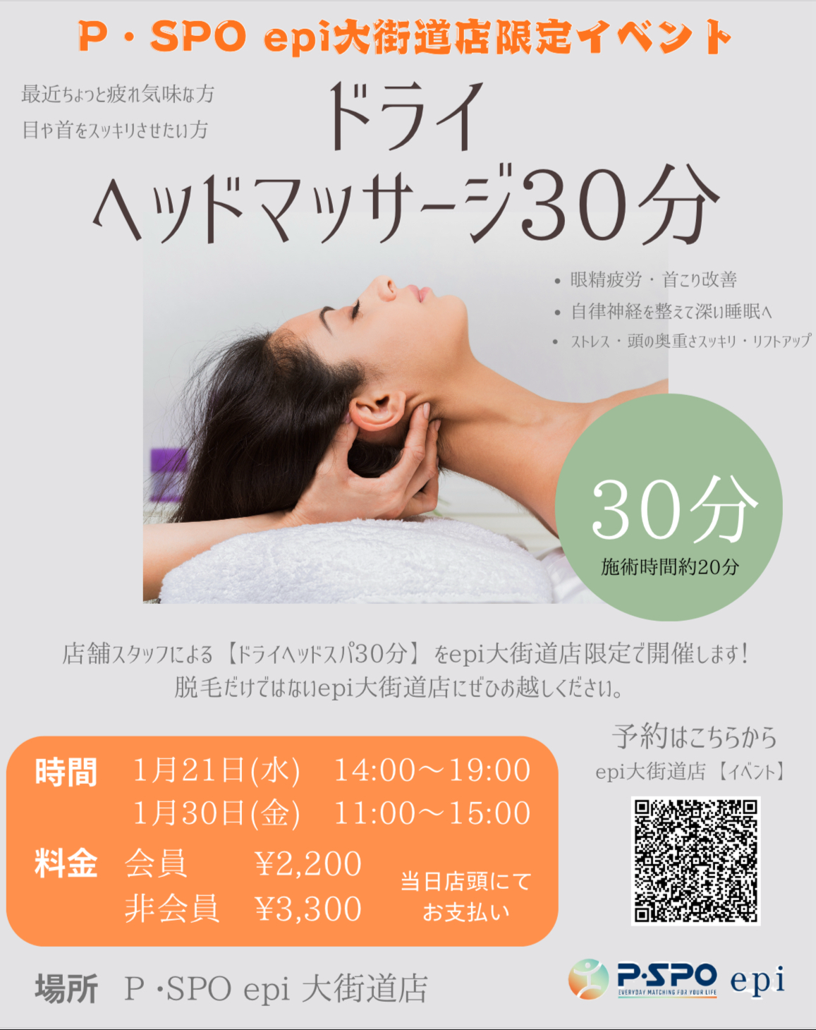 P・SPO epi 大街道店では、店舗スタッフによるドライヘッドスパ体験イベントを実施します。正月明けの眼精疲労や首・肩の疲れを感じやすい時期に合わせ、短時間でリフレッシュできる体験型企画です。