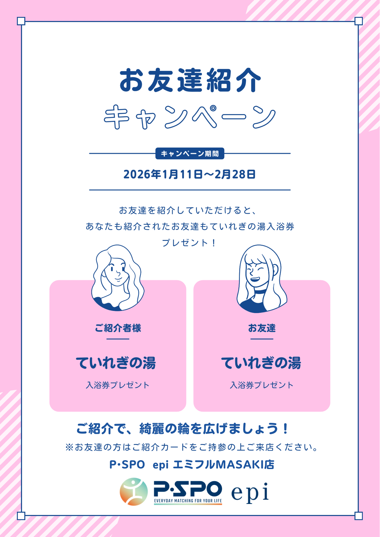 P・SPO epi エミフルMASAKI店では、友達紹介キャンペーンを実施しています。紹介により新規来店された方と、紹介者の双方に「ていれぎの湯 入浴券」をプレゼントします。