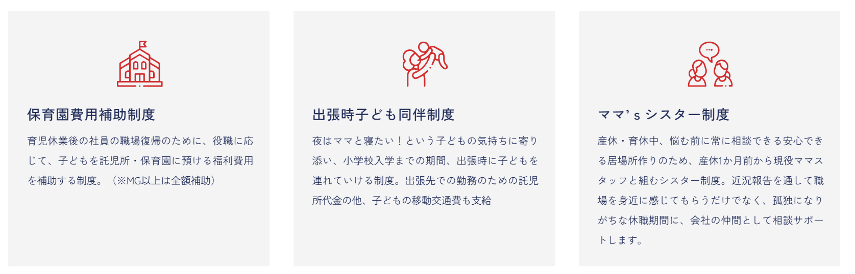 当社は、子育てをしながら活躍する女性があたりまえのようにいる環境です。役職に応じた(マネージャー以上は全額補助)保育園費用の補助制度の他、出張時の子ども同伴制度、ママ’sシスター制度など、女性社員割合99%ならではのユニークな子育て支援で、ライフステージによる環境変化におけるキャリア支援をする制度を目指しています。