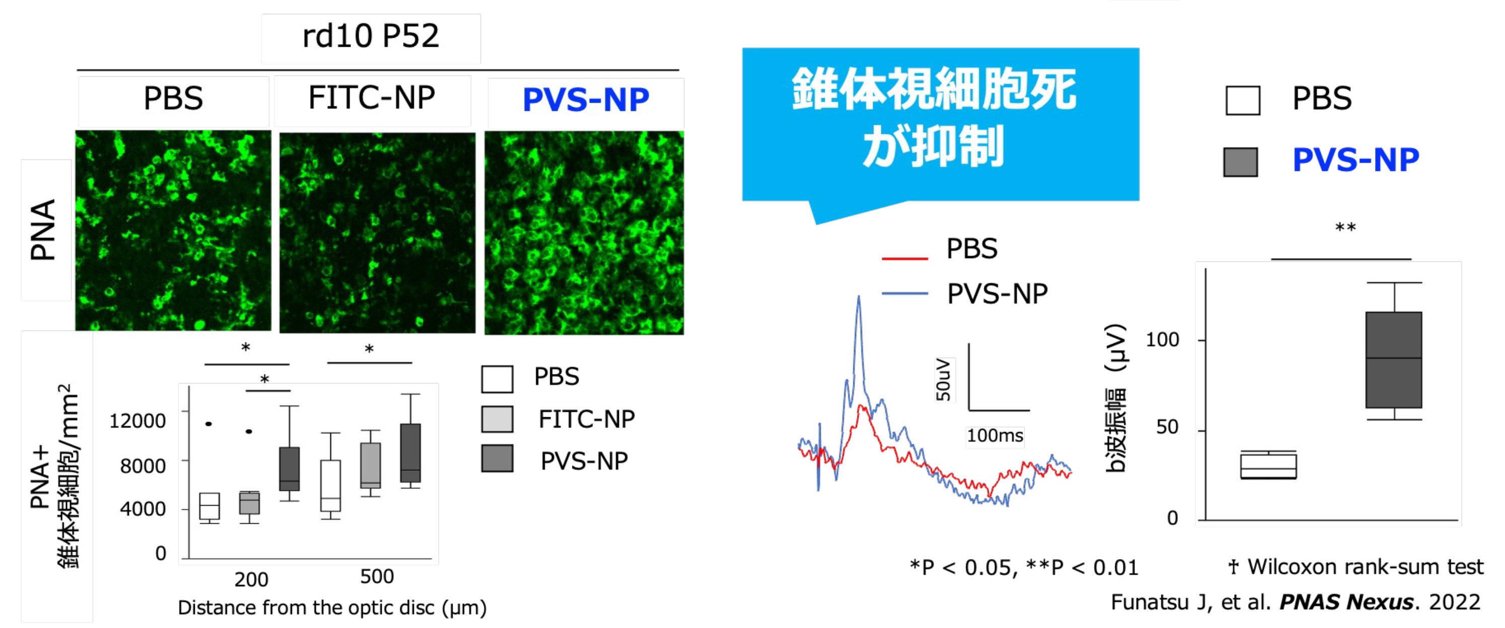九州大学医学部・村上佑介准教授らの研究により、末梢血中の炎症性単球がマクロファージに分化し、網膜変性を促進することが明らかになりました。この知見に基づき、RP に対して炎症制御を軸に据えた、病因に依存しない新たな治療戦略に着目した共同開発を推進しています。RP モデルマウスを用いた有効性試験では、ピタバスタチンナノ粒子静脈内投与製剤により、4週に1度の投与頻度においても錐体視細胞死が有意に抑制された結果が得られており(Funatsu et al., 2022)、RP 病態の進行抑制が期待されます。
