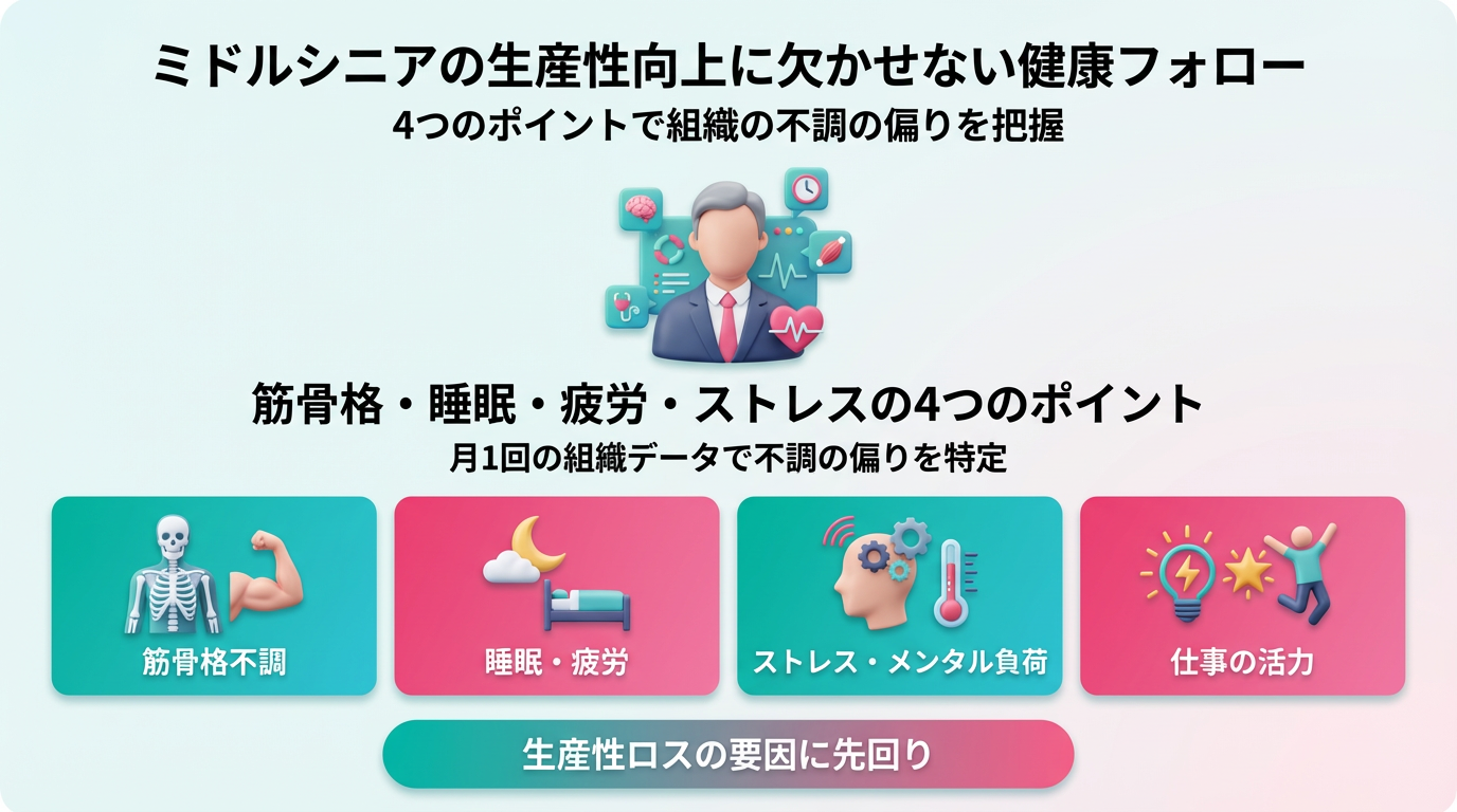 ミドルシニア層は、現場の中核やマネジメントを担い、品質・納期・意思決定・育成など組織のアウトプットに大きく関わる一方で、業務負荷の高まりや生活リズムの変化などを背景に、筋骨格の違和感、睡眠の乱れや疲労の長期化、ストレス負荷、仕事の活力低下といった不調が重なりやすい層でもあります。こうした状態は、欠勤や休職のような分かりやすい事象になる前から、集中力の低下、判断の遅れ、手戻りの増加、レビュー工数の増大、コミュニケーションの停滞などを通じて、現場の見えにくい生産性ロスとして積み上がりやすくなります。