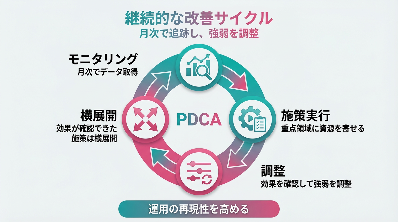 翌月以降も同じ尺度でデータを継続取得できるため、施策実行後の変化を月次で追跡し、強弱を調整できます。効果が確認できた施策は横展開し、効果が弱い領域は打ち手の切り替えや追加を行うことで、運用の再現性を高めます。限られたリソースの中で、成果に直結する領域へ集中する運用を維持できる点が特長です。加えて、部門別の結果は、社内説明や経営会議向けの報告資料としても整理でき、意思決定と現場展開の速度を上げることにつなげます。