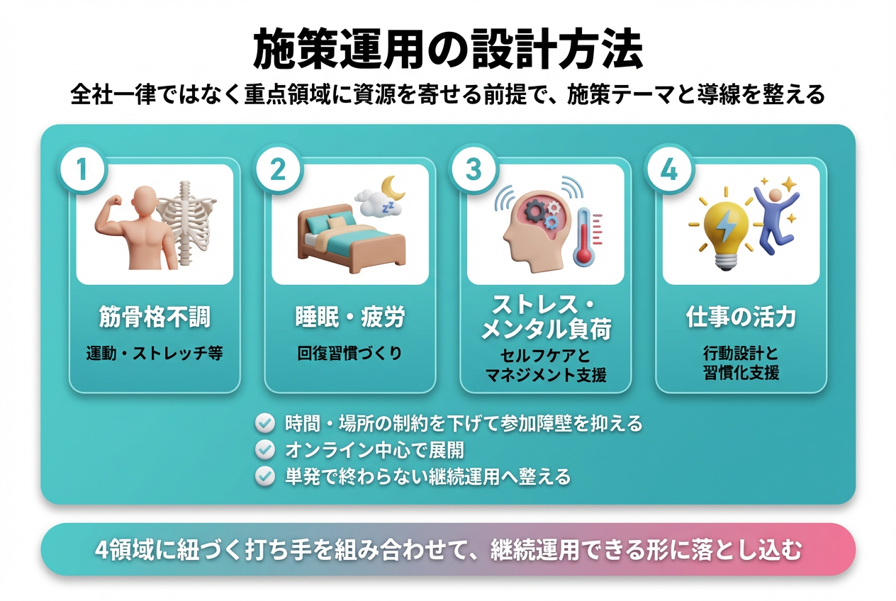 可視化結果をもとに、影響の大きい領域と組織を特定し、打ち手の順番と実行頻度を設計します。全社一律ではなく重点領域に資源を寄せる前提で、施策テーマと導線を整えます。筋骨格不調には運動・ストレッチ等、睡眠・疲労には回復習慣づくり、ストレスにはセルフケアとマネジメント支援、活力には行動設計と習慣化支援といった形で、4領域に紐づく打ち手を組み合わせ、オンライン中心で展開します。時間・場所の制約を下げて参加障壁を抑え、単発で終わらない継続運用へ整えます。