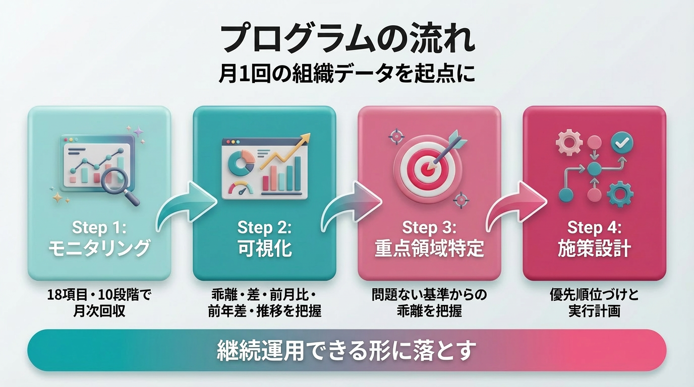 月1回の組織データで不調の偏りを捉え、重点領域の特定から施策運用、認定実務まで一体で支援します