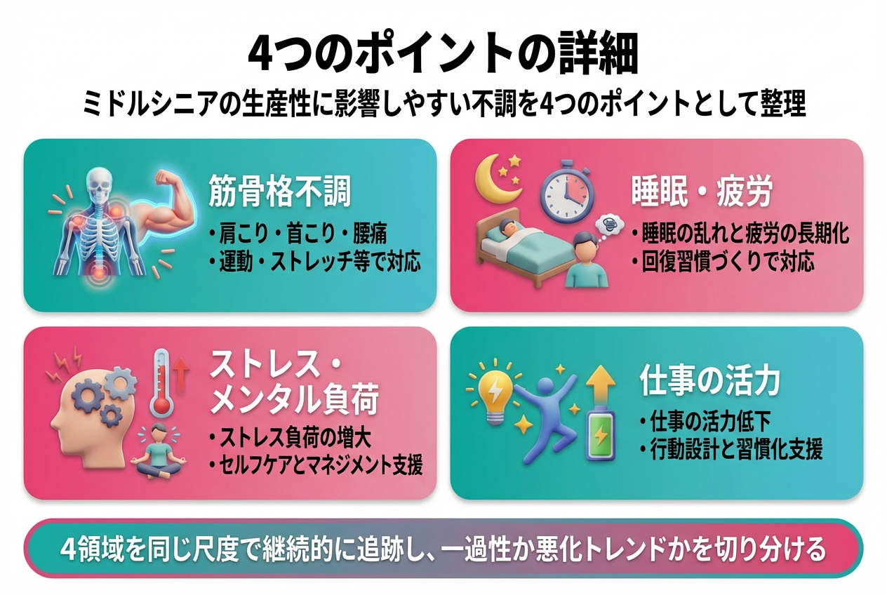 フラクタルワークアウトが提供する本プログラムは、ミドルシニアの生産性に影響しやすい不調を4つのポイント(筋骨格不調、睡眠・疲労、ストレス・メンタル負荷、仕事の活力)として整理し、月1回の組織データで定点把握することから始めます。4領域を同じ尺度で継続的に追跡することで、今月の変化が一過性か、悪化トレンドかを切り分け、対策の後手を減らす運用へつなげます。