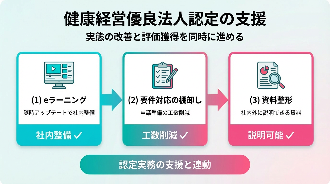また、本プログラムは健康経営優良法人認定も視野に、eラーニングを活用した社内整備、要件対応の棚卸し、社内外に説明できる資料整形など、認定実務の支援とも連動します。申請のための作業に留まらず、実態の改善と評価獲得を同時に進めることを目的としています。取り組みの全体像が説明可能な形で整理されるため、経営判断や管理職層への展開、対外的な説明にも転用しやすくなります。