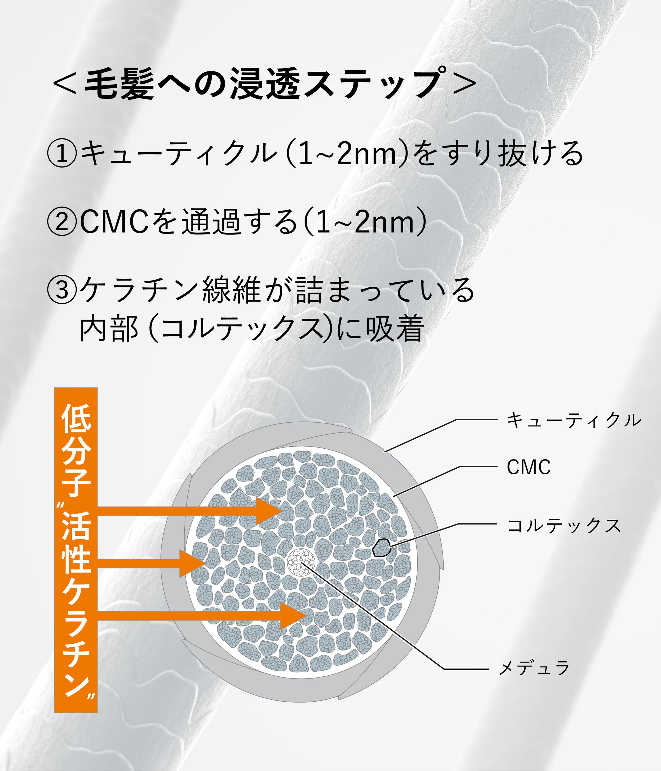 そのため、髪に浸透しやすく、且つ吸着しやすいという特長を持ち、毛髪内部から補修できる構造になっています※1。