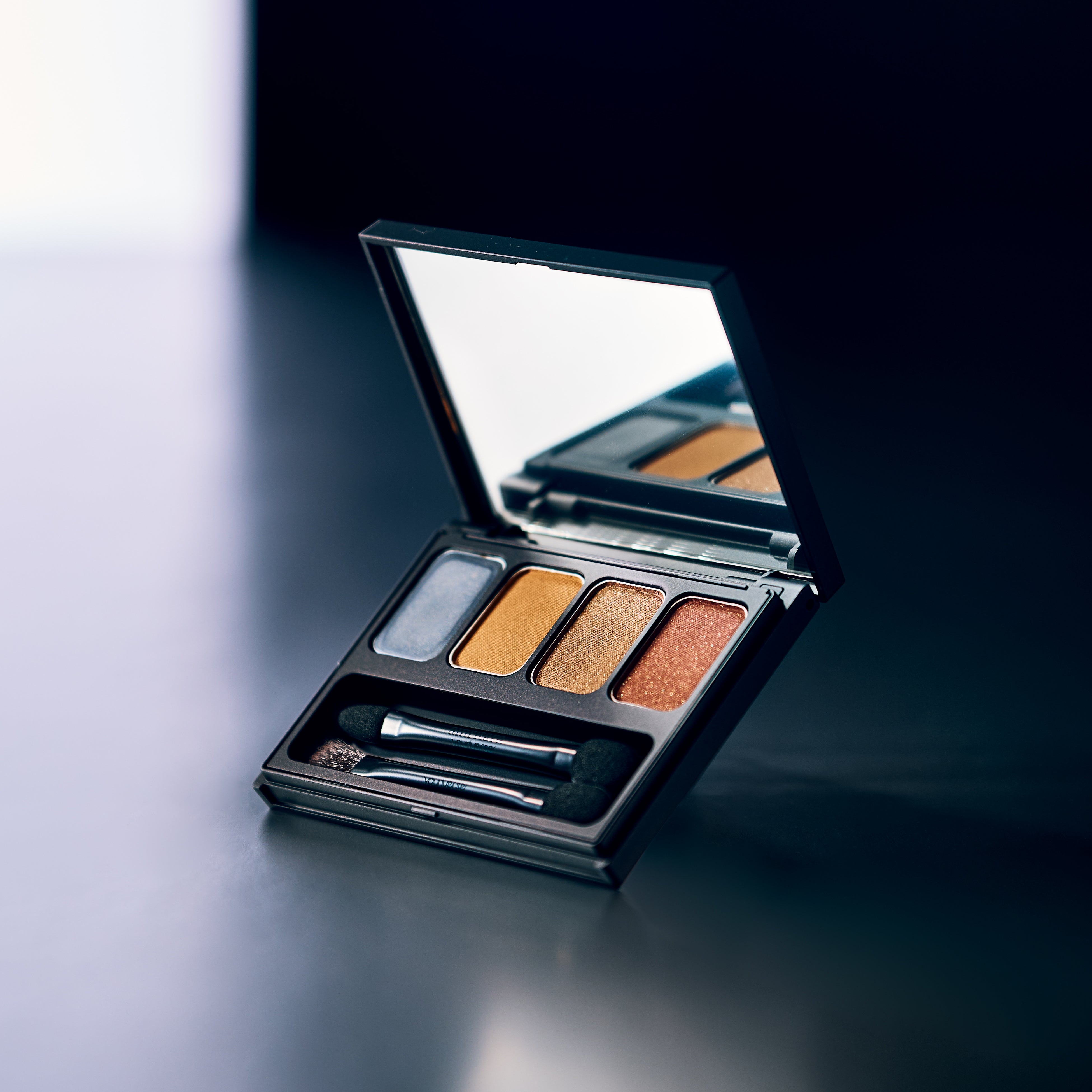 空海の胎蔵曼荼羅から着想を得たレッドブラウン、オレンジベージュ、イエローベージュ3色のパウダリーアイカラーと、意識の銀河のようなインディゴブルーのクリームアイカラーの4つのセットアップ。