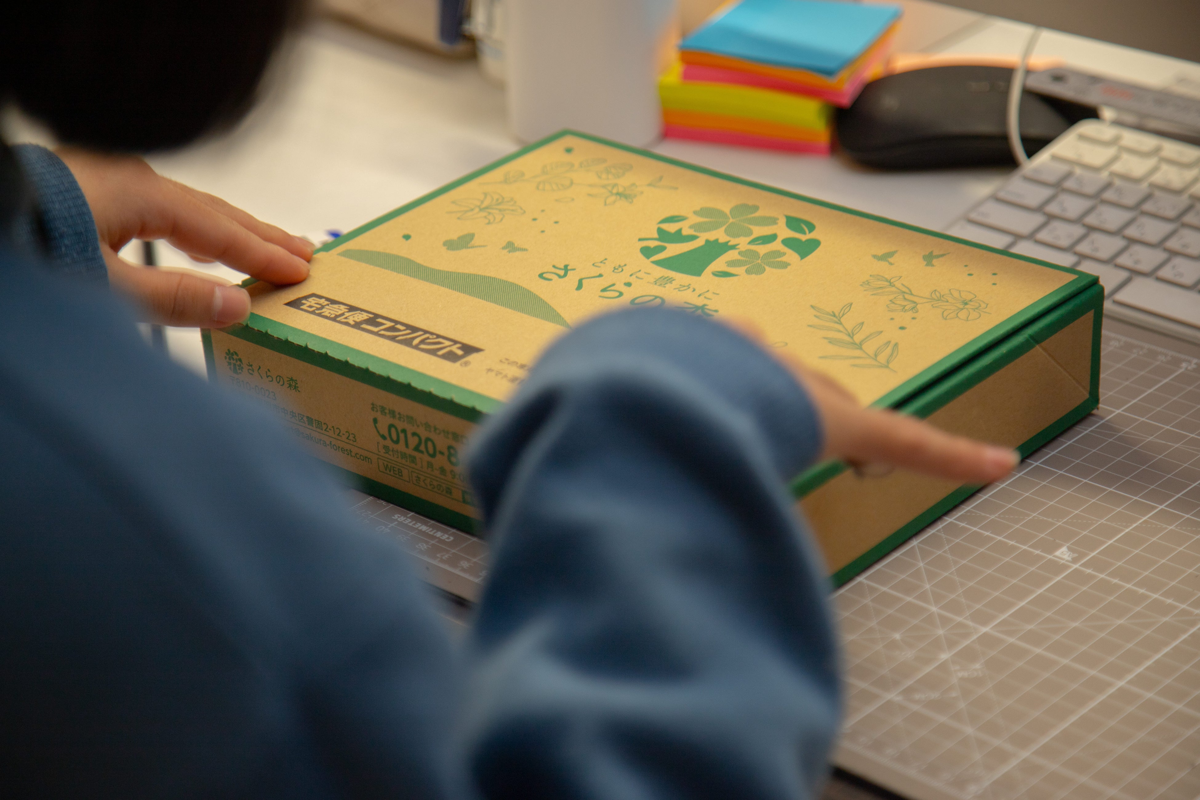 さくらの森のデザイナーは「私たちも『箱を開けた瞬間に笑顔になってもらえたらいいな』『届いたときにほっこりしてもらえますように』っていう気持ちをデザインにのせて届けているんだよ」と伝え、想いを込める仕事の本質を共有しました。