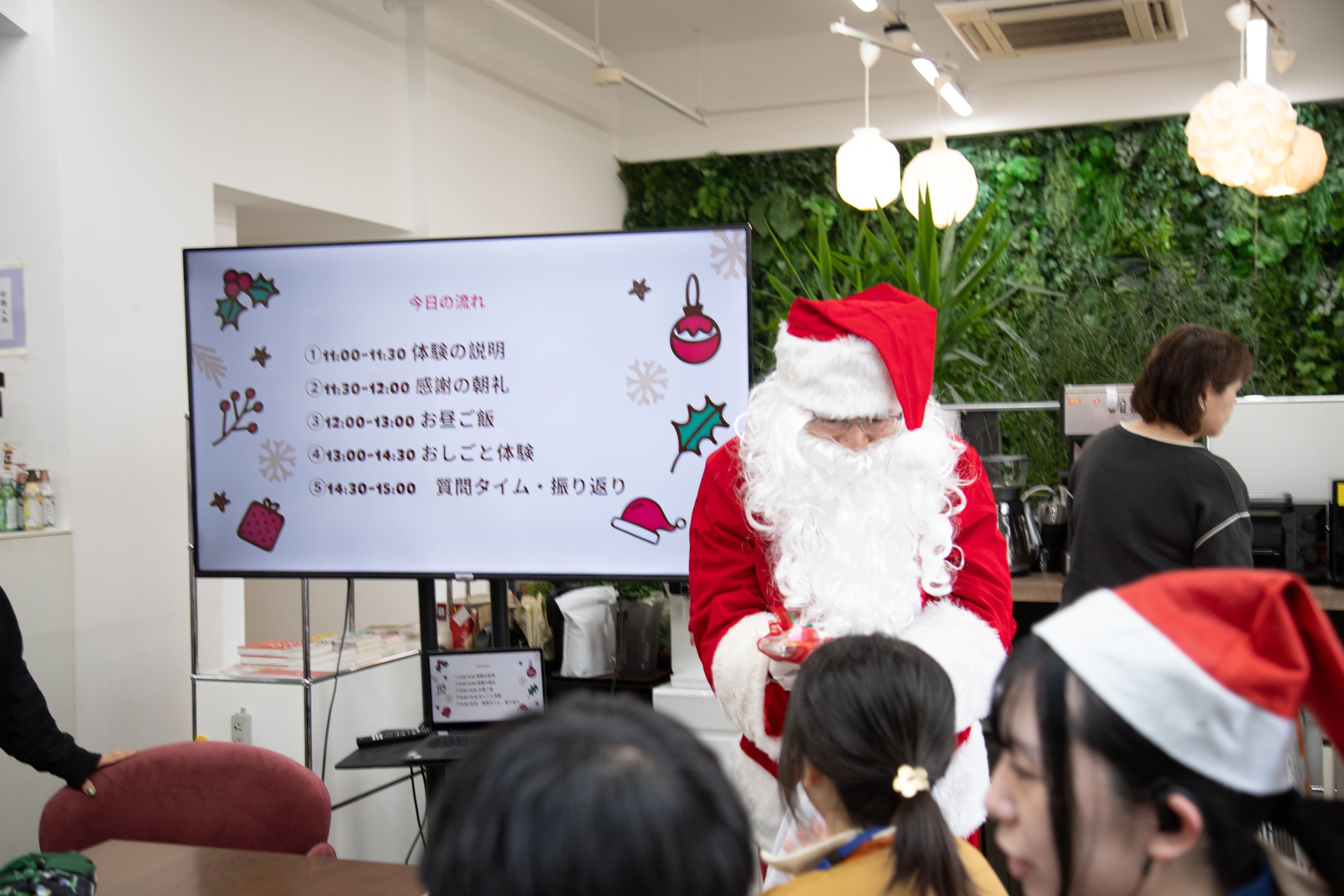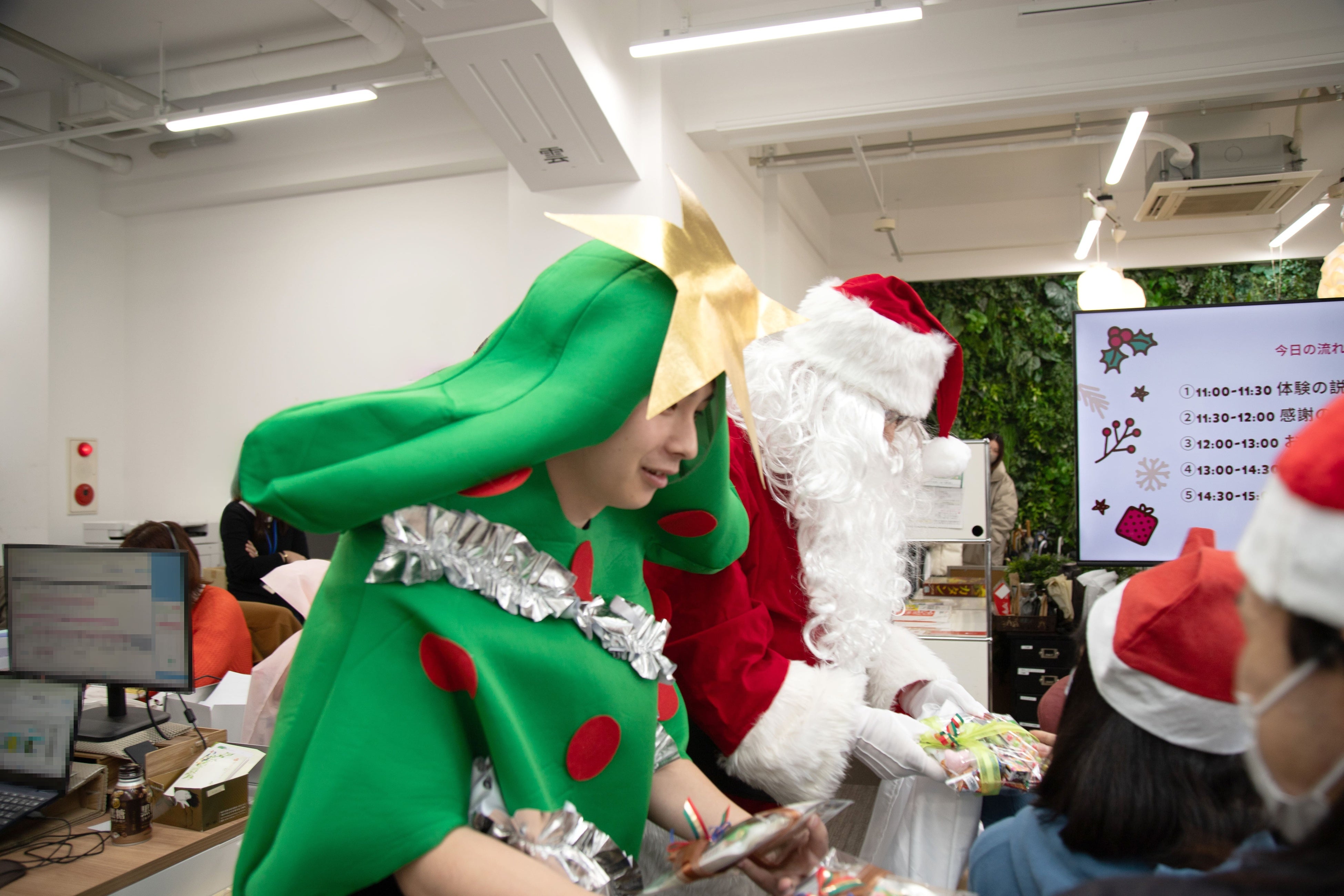 サプライズで社員がサンタクロースとツリーに扮し、子どもたち一人ひとりにプチギフトを手渡しました。驚きつつも、笑顔を浮かべる子どもたち。