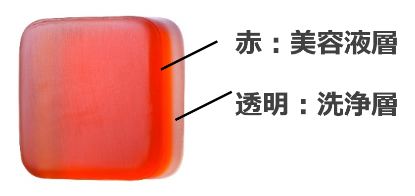 赤の「美容液層」と透明の「洗浄層」を熟成して作り上げた“枠練り石けん”