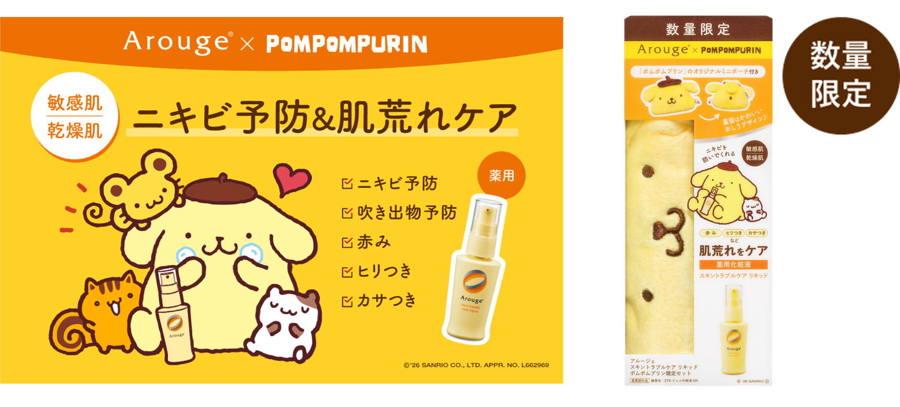 かぜ薬「ジキニン」でおなじみ全薬工業株式会社(本社:東京都文京区 代表取締役社長 橋本弘一 以下、全薬工業)の敏感肌用スキンケアブランド「アルージェ」は、株式会社サンリオ(以下サンリオ)の人気キャラクター「ポムポムプリン」とコラボした「スキントラブルケア リキッド ポムポムプリン 限定セット」を2026年2月1日(日)に数量限定で発売いたします。