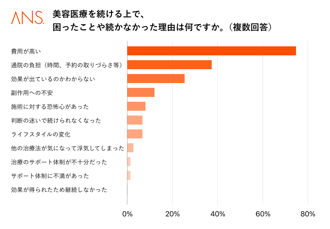 挫折の3大理由は、「費用が高い」(74.7%)、「通院の負担」(34.3%)、「効果が出ているのかわからない」(25.3%)で、従来の対面クリニックでは施術ごとに数万円の費用がかかり、予約・移動・待ち時間などの通院負担も大きく、効果実感が曖昧なことが継続を阻む要因となっています。