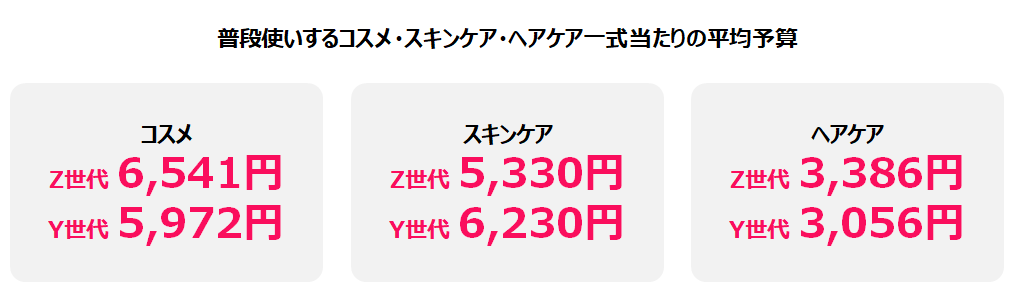世代別で、普段使いしているコスメ・スキンケア・ヘアケア一式当たりの予算も聞きました。その結果、コスメ一式の平均予算はZ世代が6,541円、Y世代が5,972円、スキンケア一式の平均予算はZ世代が5,330円、Y世代が6,230円でした。Z世代はコスメ、Y世代はスキンケアによりお金をかけていることが分かります。ヘアケア一式の平均予算はZ世代が3,386円、Y世代が3,056円と、ほぼ同じでした。