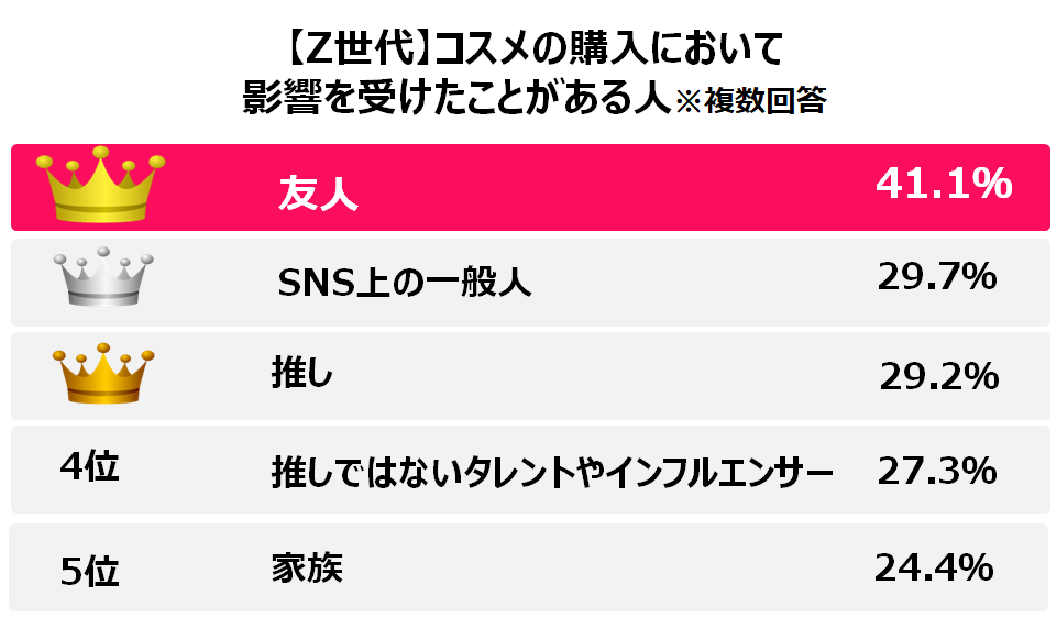 具体的に影響を受けた人としては「友人(Z世代:41.1%/Y世代:27.8%)」「SNS上の一般人(Z世代:29.7%/Y世代:21.2%)」のほか、「推し(Z世代:29.2%/Y世代:10.8%)」にも票が入りました。Z世代の方がSNSでバズっているコスメを購入した経験がある人が多いことも踏まえると、特にZ世代の間で、趣味でつながった友人やSNS、コミュニティ内での流行りからも影響を受ける場合があるのかもしれません。