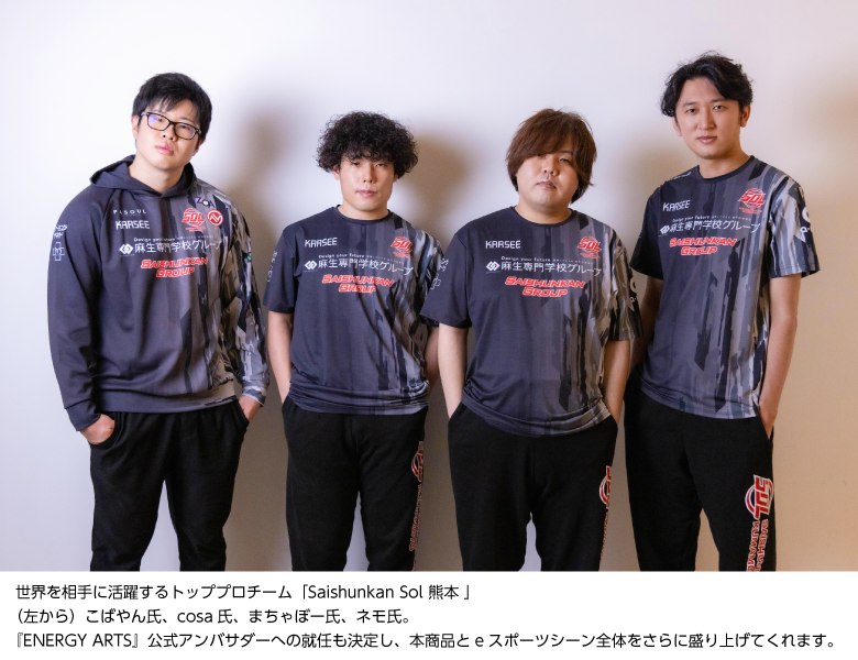 さらに今回、世界を相手に第一線で活躍するeスポーツのトッププロチームである「Saishunkan Sol 熊本」所属の2選手、ネモ氏とcosa氏にも、本商品『ENERGY ARTS』について、率直に意見を伺うことができました。