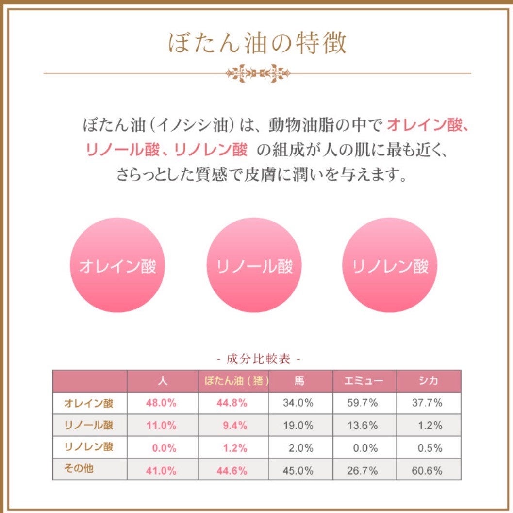 従来の馬油よりも人の皮脂組成に近いといわれるイノシシ油は、肌への浸透性が高く、自然でやさしい使用感が特長です。