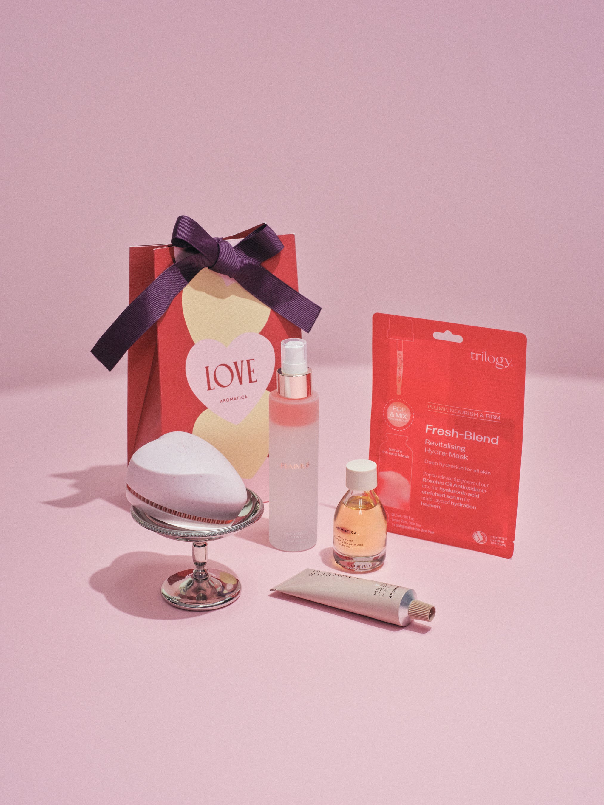 限定カラーのReFa ハートブラシ、マグノリア&サンダルウッドの香りでときめきを贈るAROMATICA ハンドクリーム&ボディオイルキットは想いを届けたいあの人へ。ひと吹きで肌が華やぐFEMMUEの二層式美容液、ここぞというときに使いたいtrilogyのご褒美マスクは、バレンタインを楽しむためのセルフケアアイテムに。