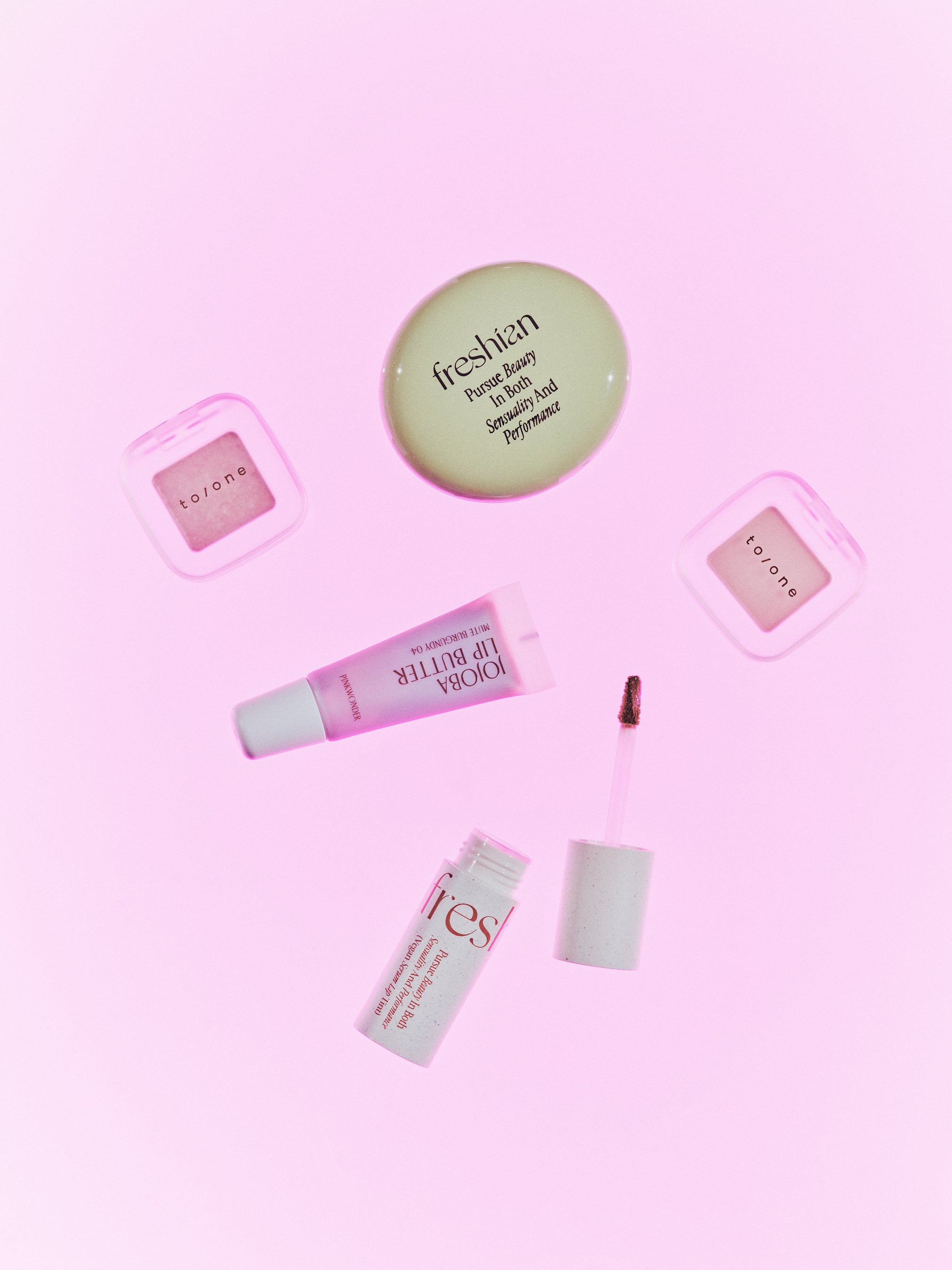 to/one(トーン)のアイカラーでまぶた全体に淡い透明感を宿し、上まぶたにグリッターをのせスペシャル感を。freshian(フレシアン)のクリームチークでバレンタインの高揚をそっと仕込んで。PINKWONDER(ピンクワンダー)のリップバターを仕込み、freshianのリップティントをオーバーリップに重ねれば、いつもより特別なときめくバレンタインメイクに。