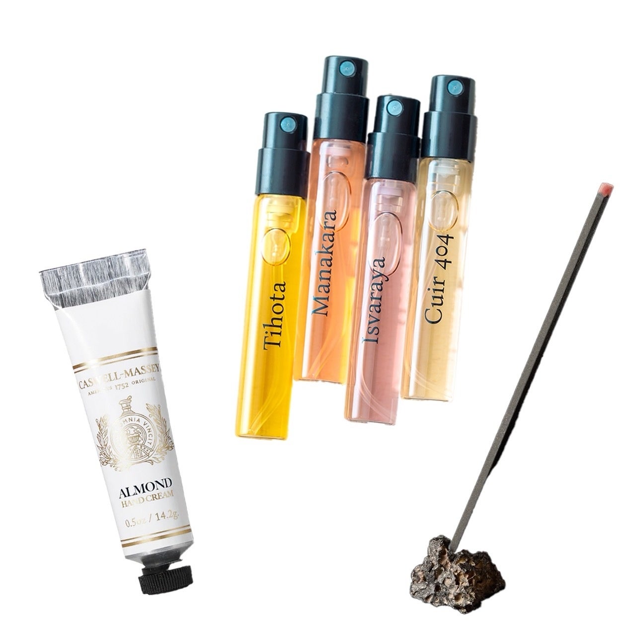 ハンドクリーム(キャスウェルマッセイ)、フレグランスサンプル3mL(インダルト パリ)、お香サンプル(ラニュイ パルファン)