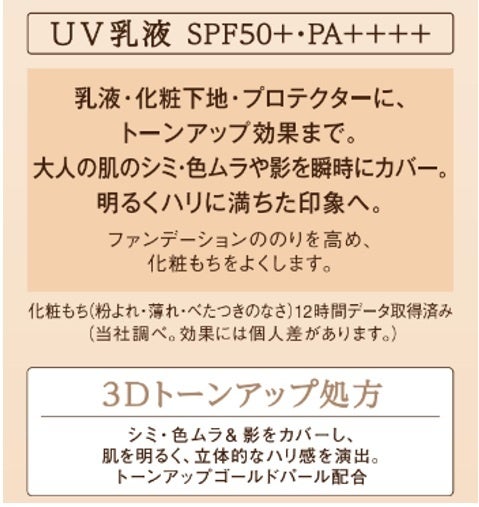 ◆ハリとうるおいのある肌へ導くエイジングケア※2。「乳液効果」、SPF50+・PA++++で紫外線から肌を守る「UVカット効果」と、ロングラスティング効果で化粧くずれを防ぐ「化粧下地」効果を兼ね備えた、1本で高機能な大人のUV乳液です。