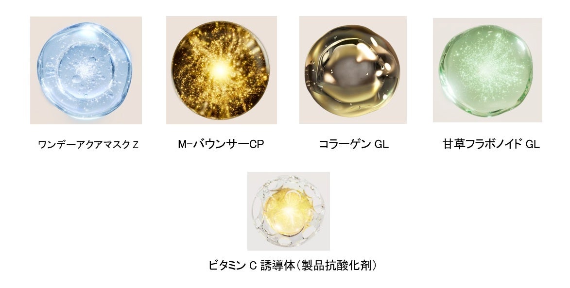 独自研究に基づいた厳選成分「ワンデーアクアマスクZ※5」、「M-バウンサーCP※6」「コラーゲンGL※7」などを配合。(現行品の「ベビーピンク」にも共通配合)