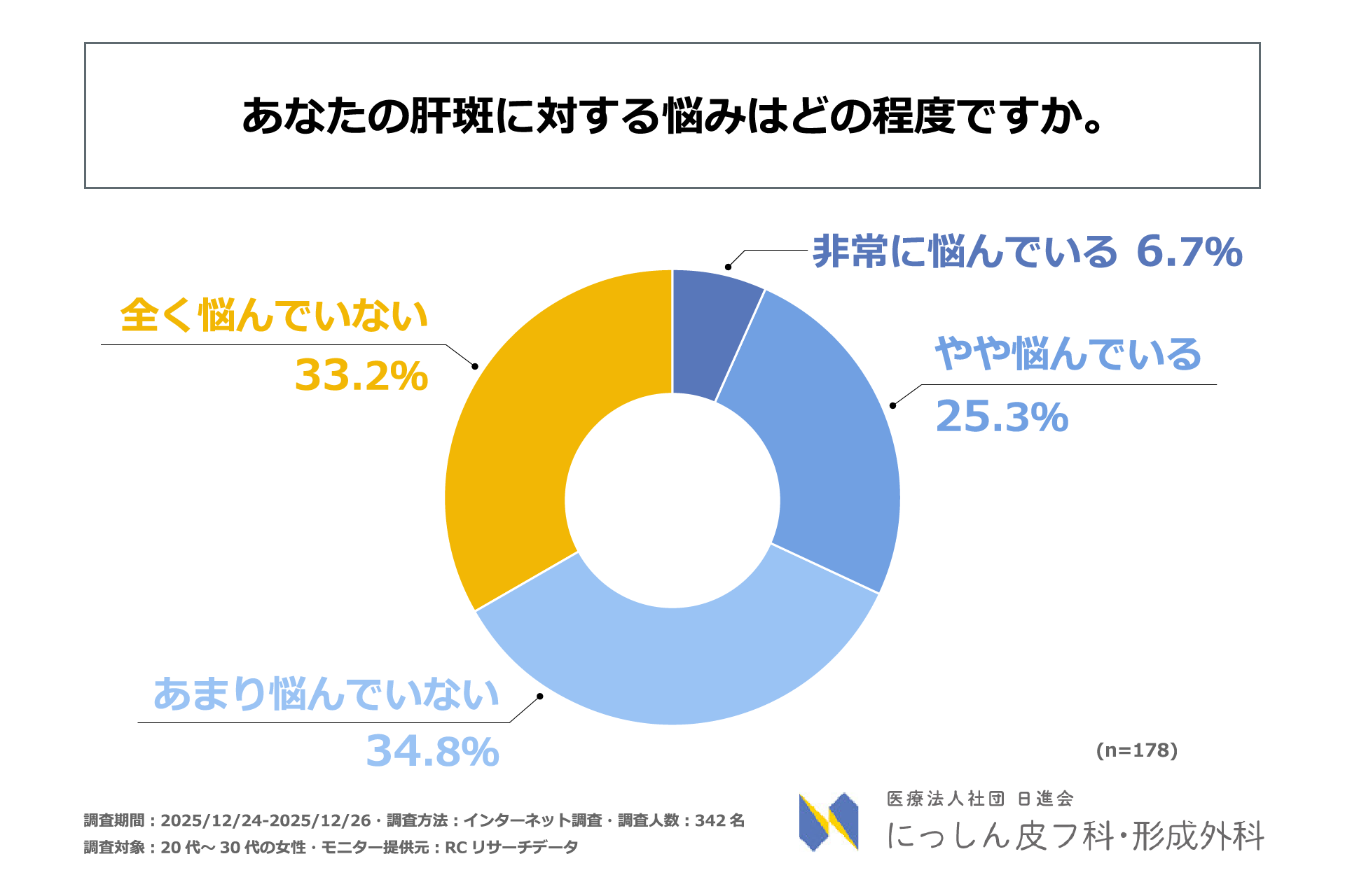医療法人社団日進会 にっしん皮フ科・形成外科(所在地:埼玉県さいたま市、理事長:平岩 亮一)は、20代~30代の女性を対象に「20代~30代の女性のスキンケア習慣と肝斑への意識に関する調査」を実施しました。この調査から、20代~30代の女性が抱える肌の悩みや日々のスキンケア習慣、肝斑に対する認知度や悩みの実態などが明らかになりました。